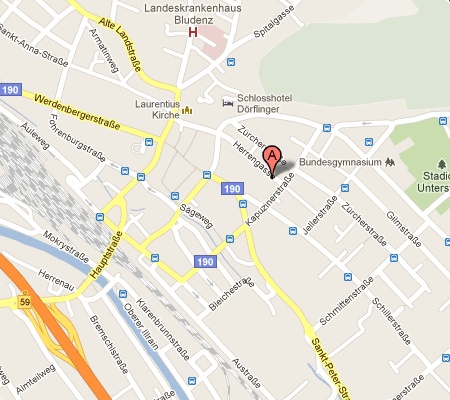 nach der Autobahnabfahrt Bludenz/Bürs rechts abbiegen - die Brücke Richtung Altstadt überqueren - dann rechts abbiegen und geradeaus bis zum Oberen Tor fahren - dort rechts abbiegen - geradeaus bis 200 Meter nach dem Viehmarkt-Parkplatz